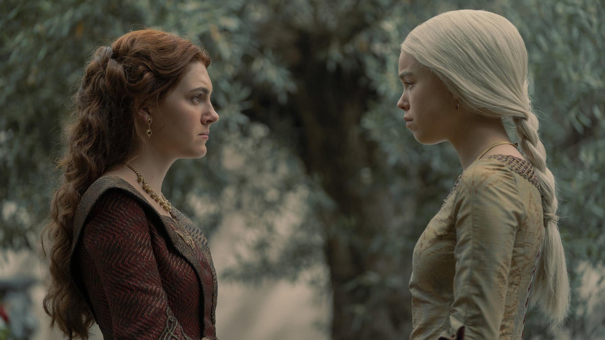 Though the rift between the two childhood friends Rhaenyra and Alicent has already begun to form, there are brief moments in this episode where their friendship is rekindled. After Daemon’s return, Alicent and Rhaenyra have a quiet conversation, speaking of how they miss one another’s company. Later in the episode, Alicent defends Rhaenyra against accusations that are levied against her. She goes to Rhaenyra with privileged information, attempting to help her. She sticks by her side against her own husband, the King.